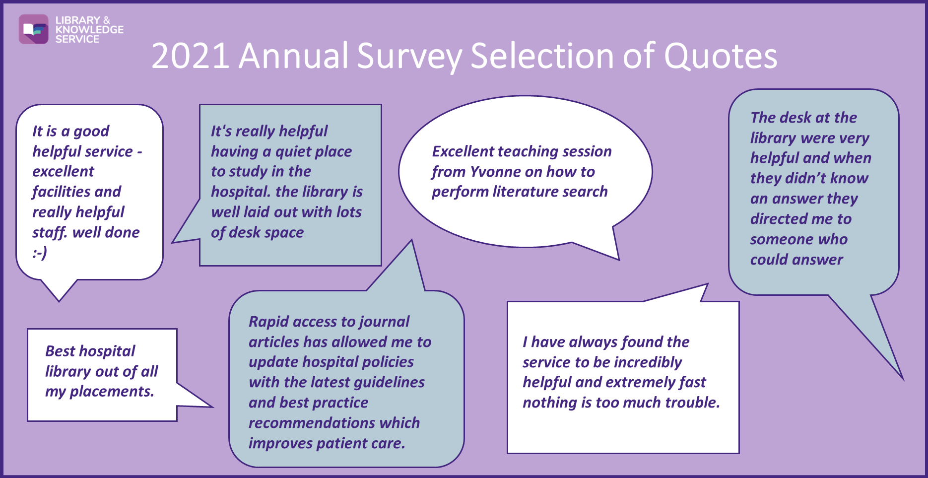 A. Are you doing a course? Are you helping with an audit? Writing a presentation? Working on a policy or SOP? Trying to keep up to date with the latest reports and guidelines? Looking for information for a patient? Working towards revalidation? Need a quiet space to do some work? Need help finding a piece of research or journal article? Want a break and something more relaxing to read? These are only a few of the things we can help you with. Browse our website to find out more about our services or email us if you have any questions. We’re here to help and can do more than you think…